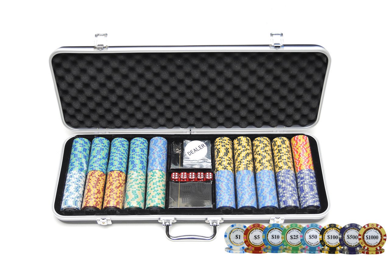 This is our 14 gram Monte Carlo poker chip set. This set includes 500 clay composite casino grade poker chips in a heavy duty black aluminum case. The set also features a dealer button, 5 dice and 2 decks of playing cards. These 14 gram Monte Carlo poker chips will bring the look and feel of a casino card room to any home game.