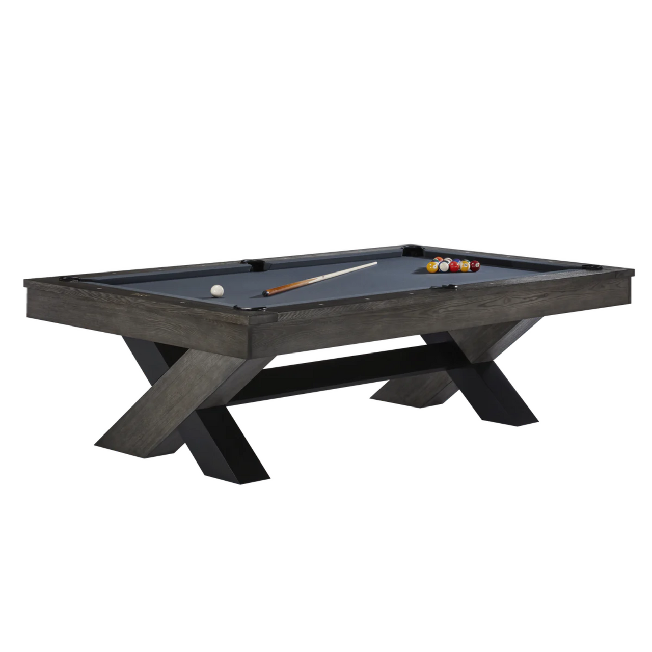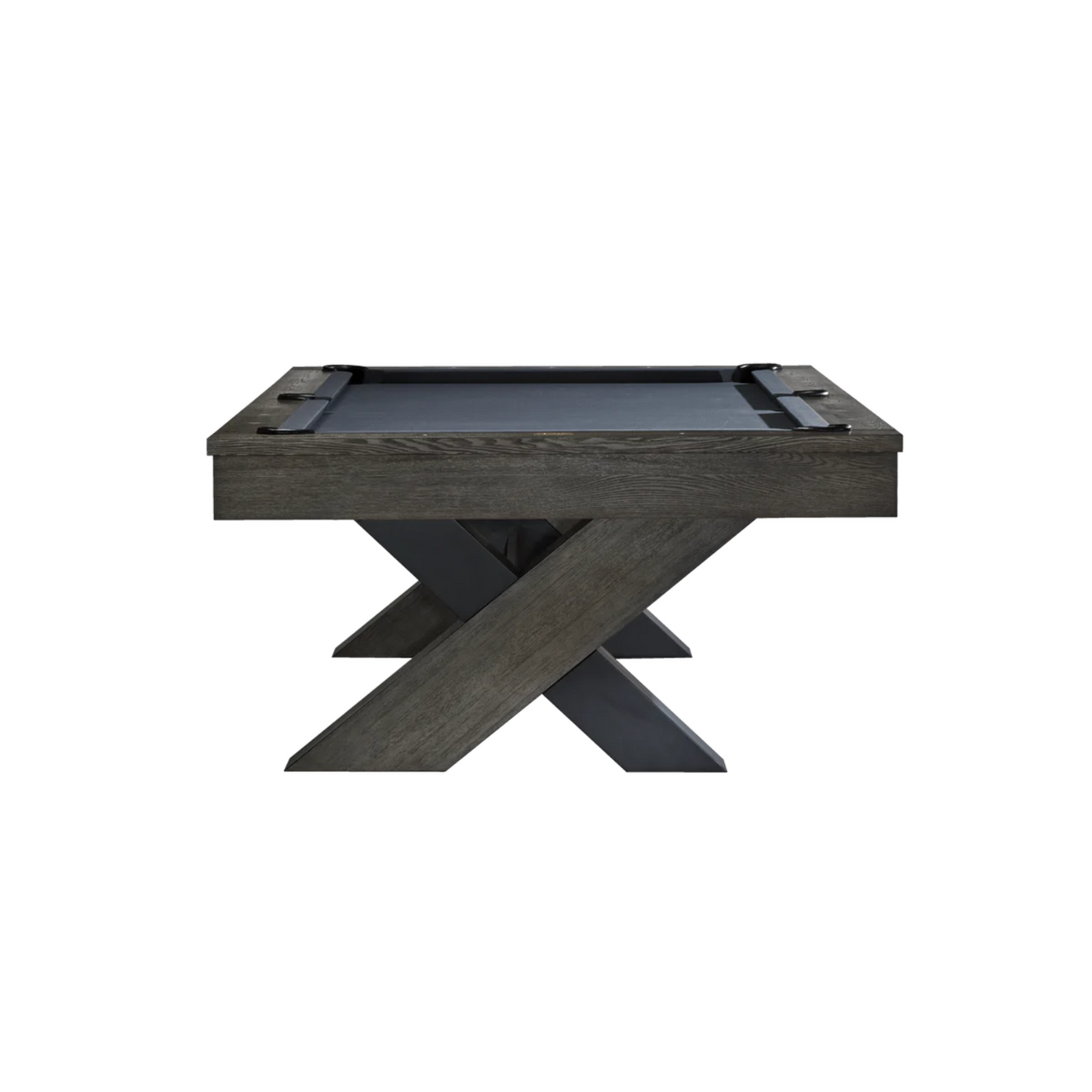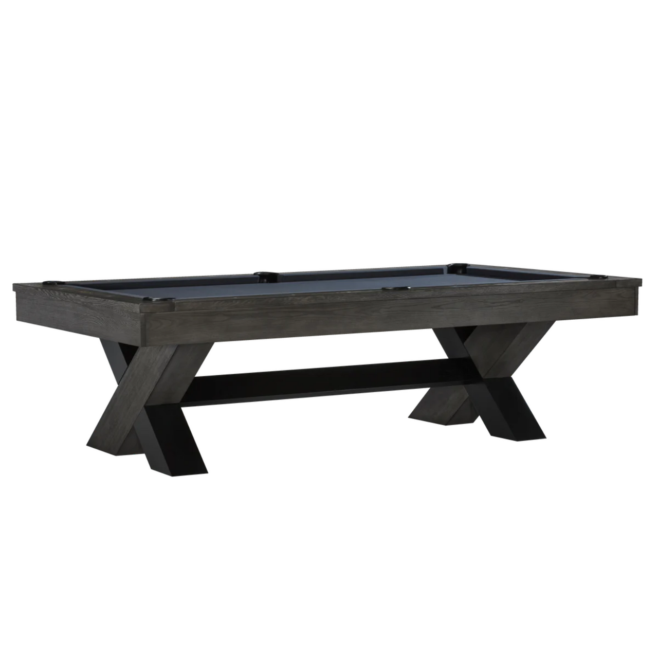 The Halifax is an urban-inspired design with a two-tone charcoal finish and sleek matte black metal construction. Its bold, sculptural silhouette features a contemporary X-leg base and is perfect for making a statement in any game room. White pearlized diamond rail sights, K66 premier cushion rubber, and internal drop pockets complete the pool table.