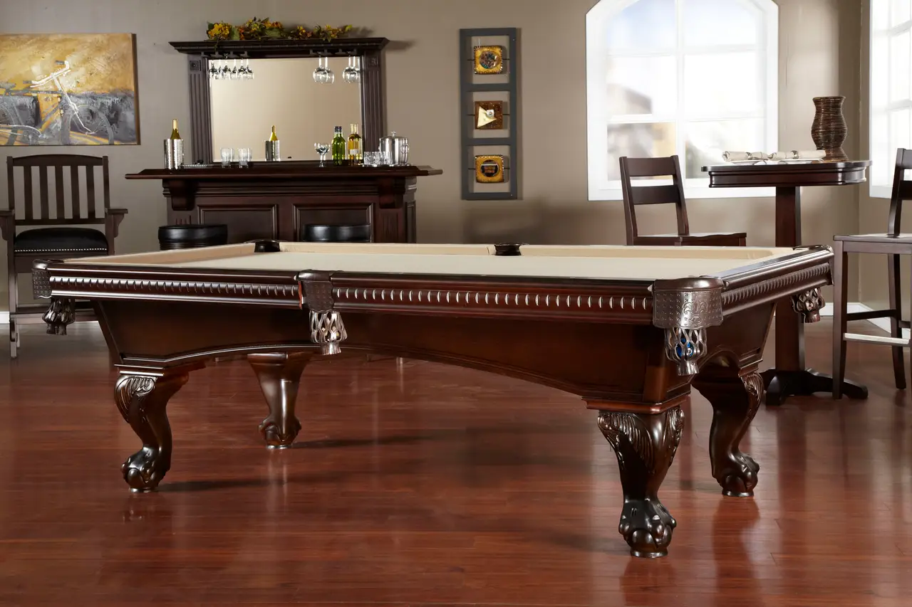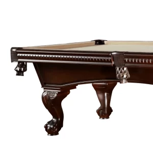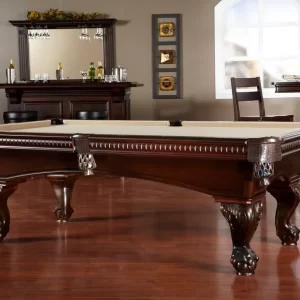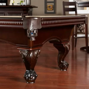 The Marietta Pool Table combines classic elegance with modern craftsmanship to create a stunning centerpiece for any game room. Its traditional claw-and-ball feet, fleur-de-lis leather pockets, and uniquely patterned rails evoke a sense of timeless charm. White molded pearlized diamond rail sights add sophistication, while the striking Sierra stain enhances its visual appeal. Crafted from American Poplar hardwood with reinforced construction, including two cross members and two center beams, this table ensures stability and durability for years to come. Designed for optimal performance, it features K66 premier cushion rubber and custom-tailored leather shield pockets. Whether in a cozy home setting or a bustling game room, the Marietta Pool Table is sure to impress.