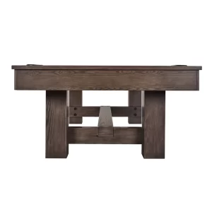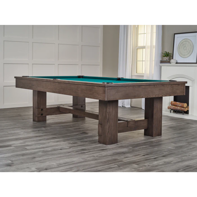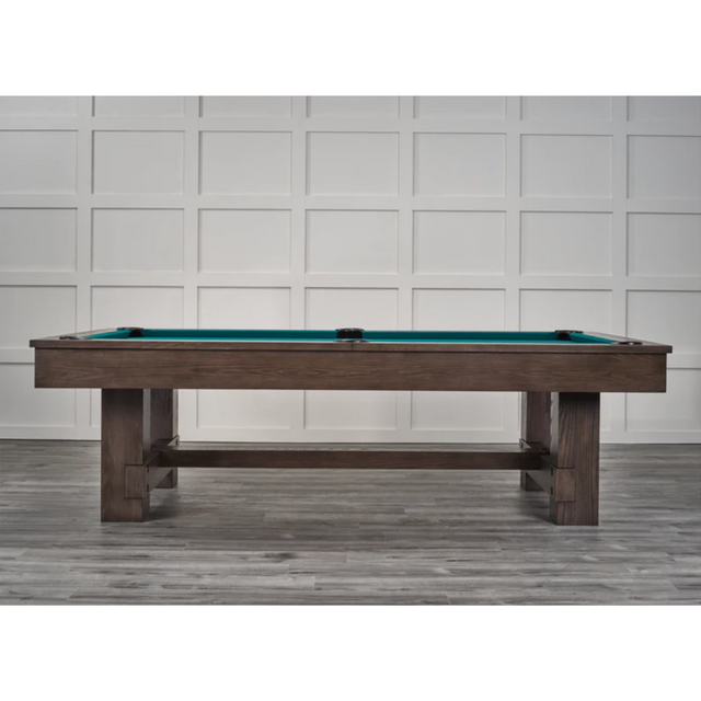 The Montana has a polished rustic design with durable timber construction. This billiard table features round black metal rail sights, a rich charcoal finish, and internal drop pockets.