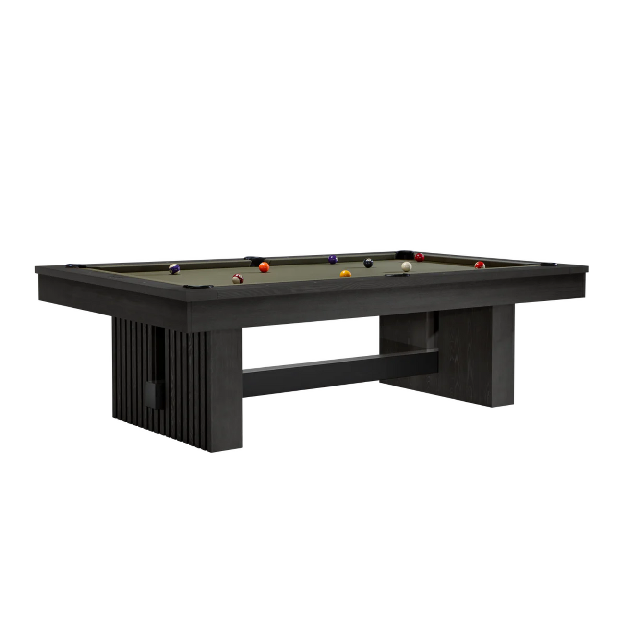 The Vancouver pool table features a modern mix of materials and textures highlighting its fresh and contemporary design. A wood batten-style base with a powder-coated metal beam completes the clean, organic aesthetic. Pair this billiard table with a dining conversion top for ultimate entertaining. This pool table features white pearlized diamond rail sights, robust construction, and internal drop pockets.