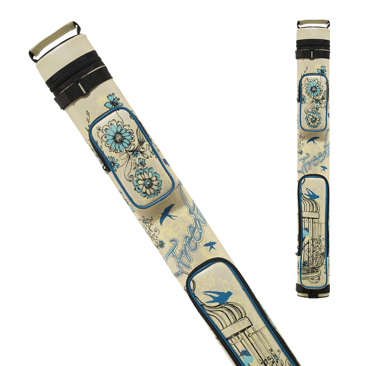 This Athena pool cue case is delicately designed with flowers and blue birds effortlessly flying about with “Freedom” embroidered between the two accessory pockets. The case holds 2 pools cues and comes with an upper handle and an adjustable shoulder strap.