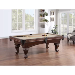 The Canton Pool Table pulls out all the stops when it comes to refined elegance and sophisticated design. The beautifully carved solid Maple, Poplar, and Birch veneer combine with oversized claw feet to create a distinctive statement, drawing the eye up to the tournament-quality surface, diamond sights, and custom shield pockets. Finished by hand in a rich Sierra stain, the Canton is sure to become the centerpiece of the room.