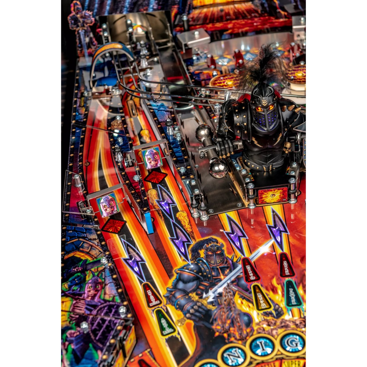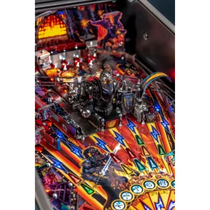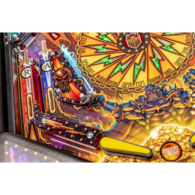 Stern’s Black Knight: Sword of Rage Pro model features stunning and distinctive hand-drawn art in homage to this pinball icon. The game features a custom sculpted, interactive, and multi-functional Black Knight bash toy. This interactive Black Knight toy features a bi-directional motorized flail, a glowing RGB helmet with individually controllable expressive lighting to interact and taunt players with custom speech, and a sliding coil-driven shield that will bash and block your shots.