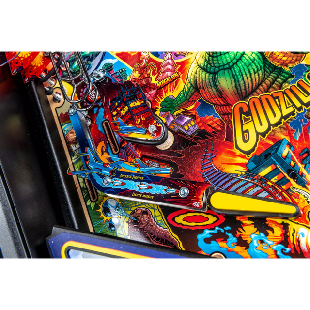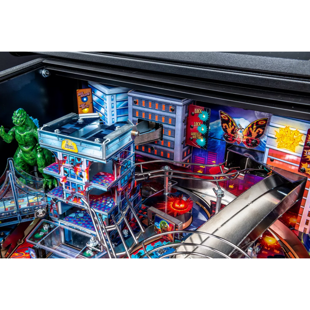 Chaos and destruction ensue on the playfield with Godzilla multiball, started by shooting one of the various shots in and through the centrally located skyscraper. In the Premium model, a motor actuates the skyscraper, diverting balls through each of its five stories as it collapses, ultimately locking three balls on its roof. The Premium playfield also features a collapsing bridge ramp. This animated breakaway ramp is guarded by a custom molded Godzilla and can divert pinballs back to the flipper or directly onto the playfield during Bridge Attack multiball.