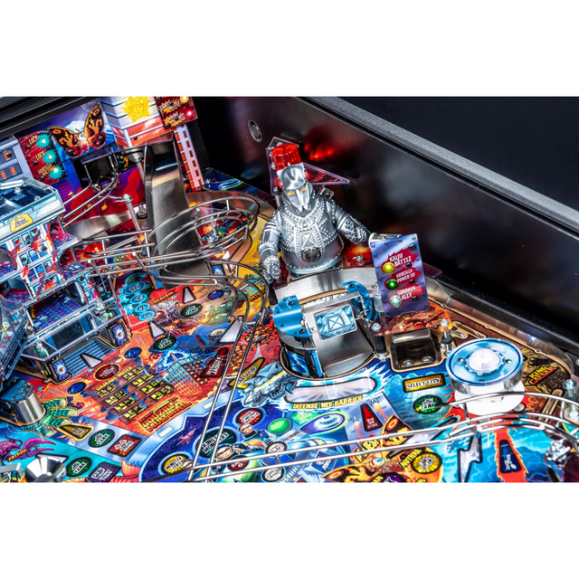 On the Premium model, Mechagodzilla features a motorized three-bank target set which rotates to reveal a spinner and jump ramp. Players will engage the Kaiju in battle by launching pinballs with the jump ramp and bashing the magnetic ball catch on its chest to start Mechagodzilla multiball.
