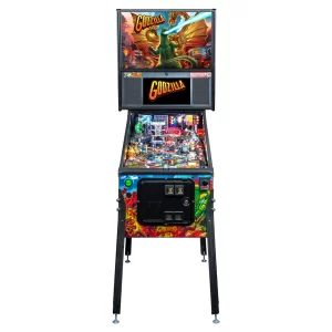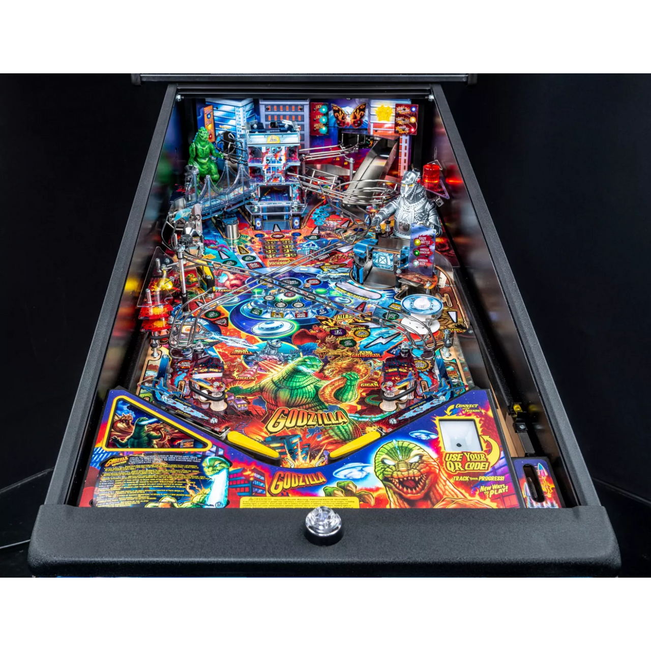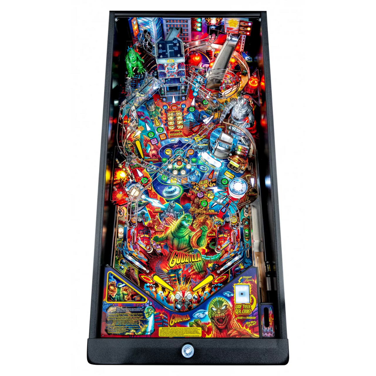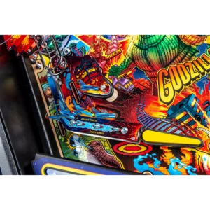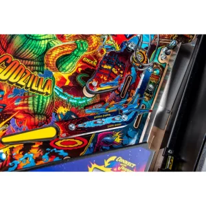 All models of Godzilla pinball machines feature an innovative “Magna Grab” magnetic newton ball, capable of catching pinballs from five different shot paths, including off the plunge. This device can also divert pinballs to set up shots from the upper left flipper. The game also includes the iconic title song “Godzilla” by Blue Oyster Cult, stunning hand-drawn artwork by Zombie Yeti, intricate wireform ramps, three spinning targets (Heat Ray, Mechagodzilla, and Monster Rampage), three flippers, three “powerline” themed stand-up targets and a UFO pop pumper. The game highlights video and audio from ten* Toho Showa Era Godzilla films to create a one-of-a-kind immersive Godzilla pinball experience.