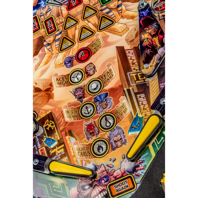 The Premium model includes twelve Iron Maiden songs with players going to battle as Eddie with the help of four flippers, two spinners, a set of 3-bank drop targets, metal and wireform ramps, a captive ball mechanism, a dual up-post lock mechanism, and a center bullseye target.