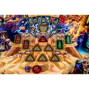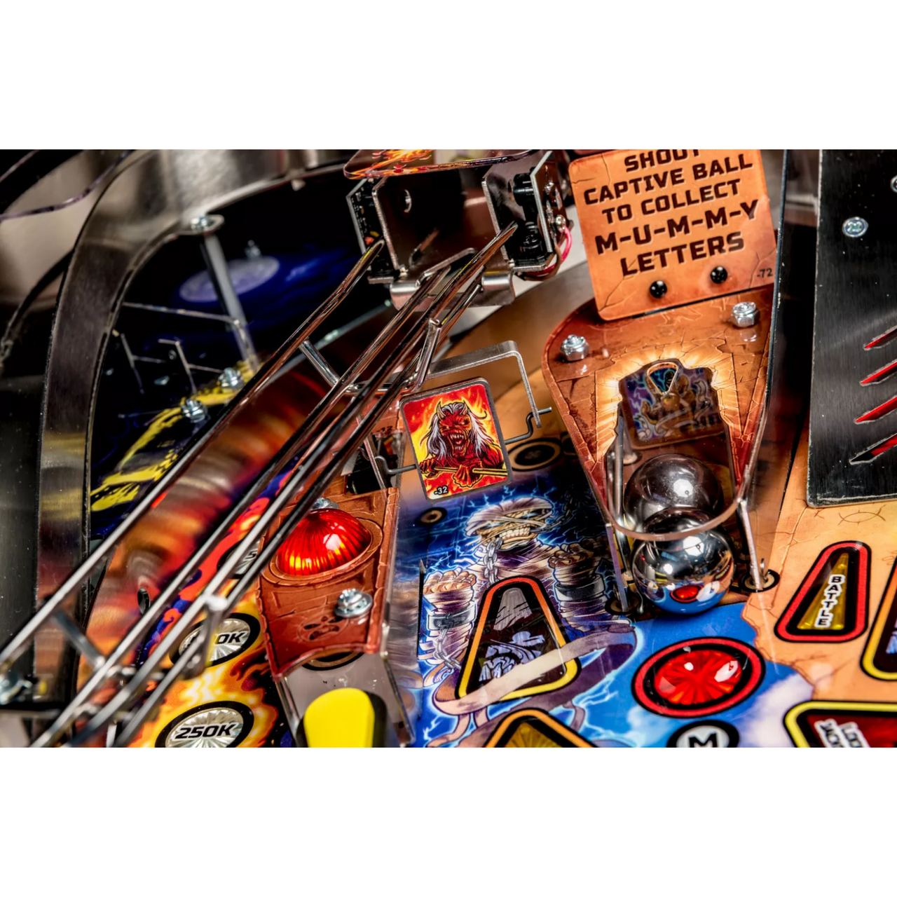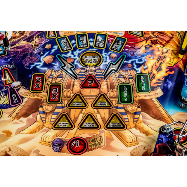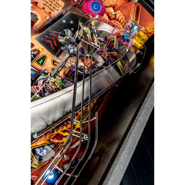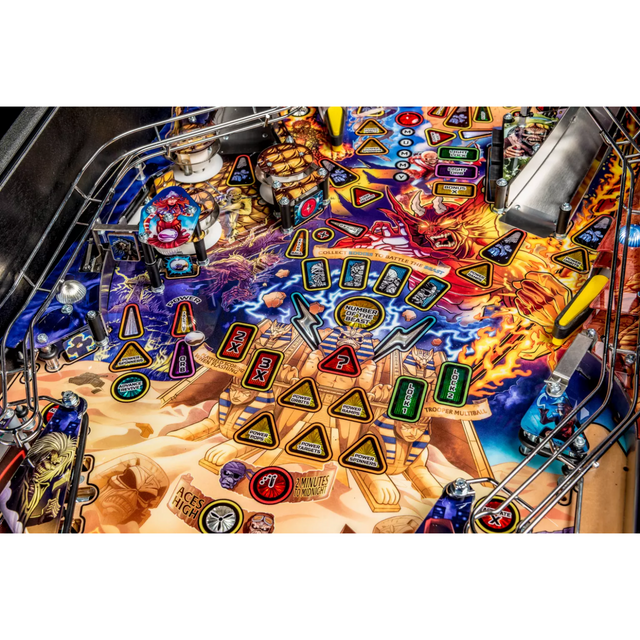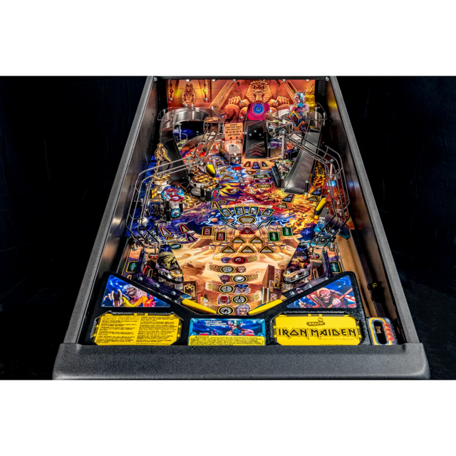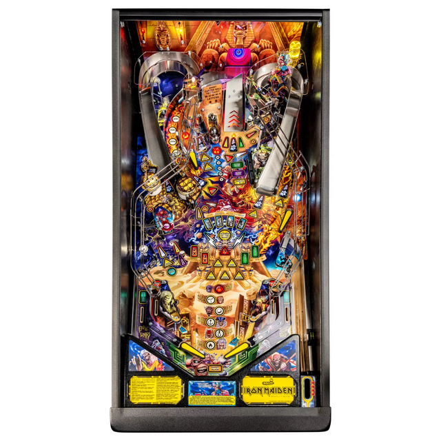 Pro model includes twelve Iron Maiden songs with players going to battle as Eddie with the help of four flippers, two spinners, a set of 3-bank drop targets, metal and wireform ramps, a captive ball mechanism, a dual up-post lock mechanism, and a center bullseye target.