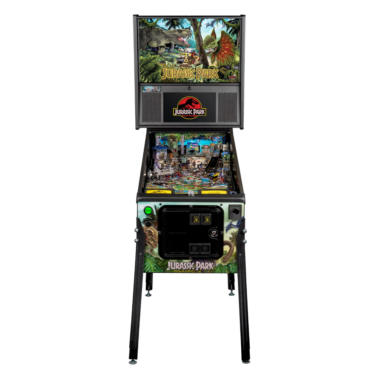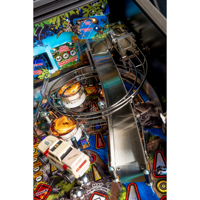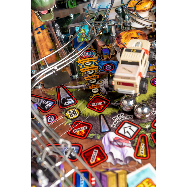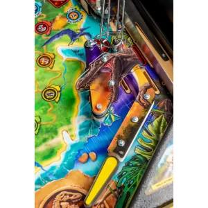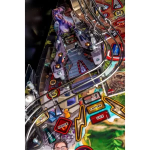 The Pro model also features a Jungle Adventure Vehicle target in the middle of the playfield that is a spinning Newton Ball. This kinetic target registers direct hits, determines the direction players navigate on the island during gameplay, and lights T. Rex modes. The model includes three full sized flippers, four custom ramps, a spinning “Spitter” target, in-lane up/down lock post that sets up critical playfield shots and distinctive hand-drawn art highlighting iconic dinosaurs from the series.