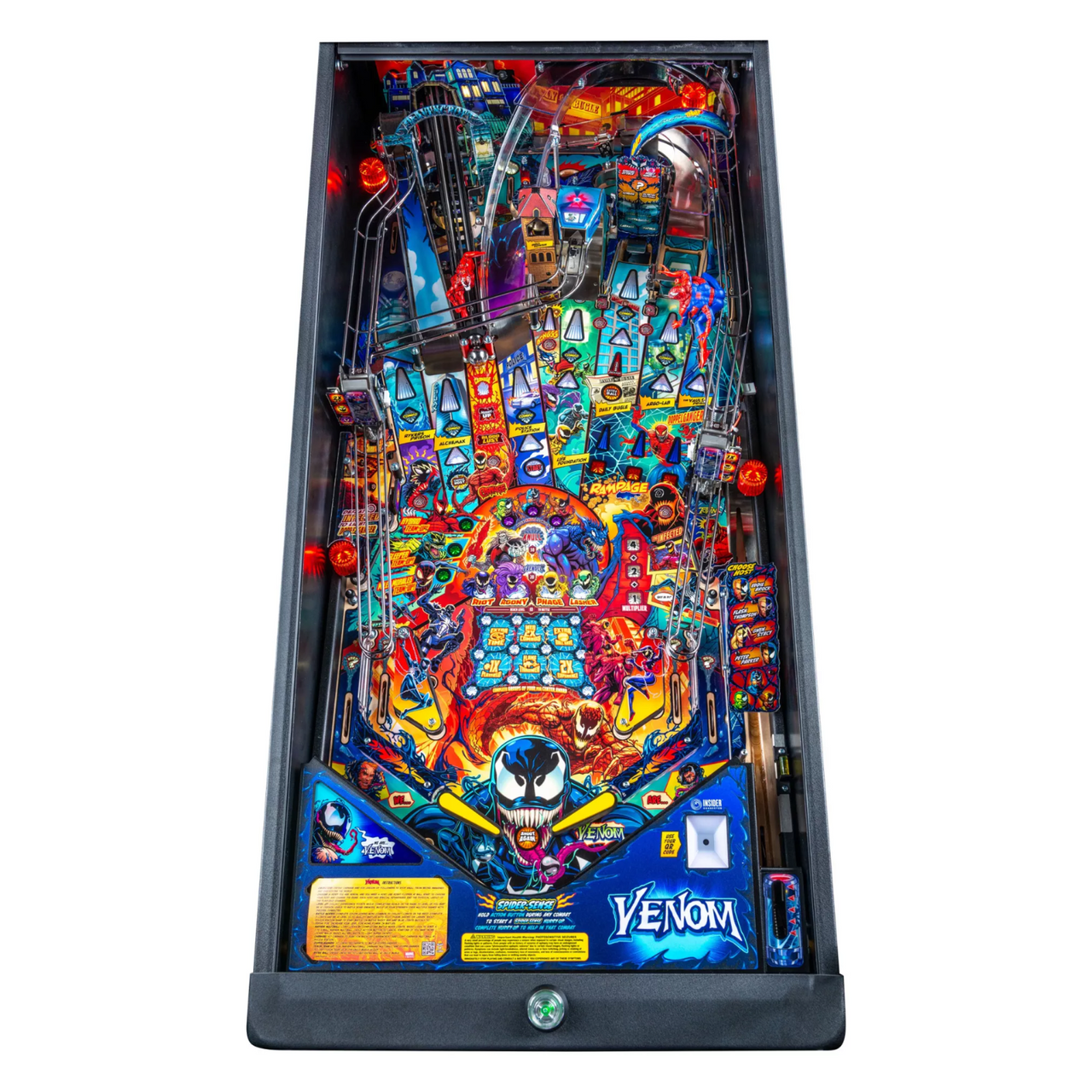 Venom pinball games include Stern’s award-winning Insider Connected™ system, which enables players to interact with the game and a global network of players in a variety of ways. Through Insider Connected, players will be able to save their game progress through connectivity persistence, allowing anyone to become a (anti)hero as you advance through the game to reach the final wizard mode at the end, no matter how many tries it might take.